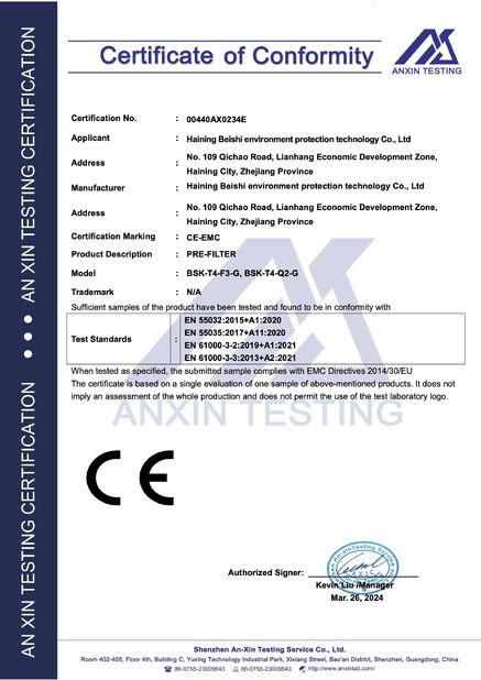 استاندارد:CE عدد:00440AX0234E تاریخ صدور:2024-03-26 محدوده / محدوده:PRE-FILTER صادر شده توسط:AN XIN TESTING CERTIFICATION |