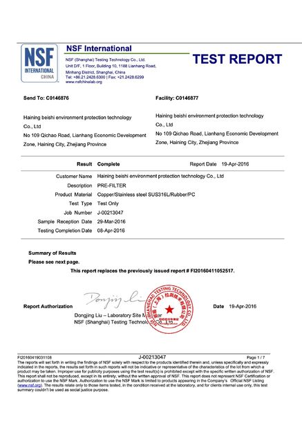 استاندارد:NSF عدد:J-00213047 تاریخ صدور:2016-04-19 محدوده / محدوده:PRE-FILTER صادر شده توسط:NSF (Shanghai) Testing Technology Co., Ltd |